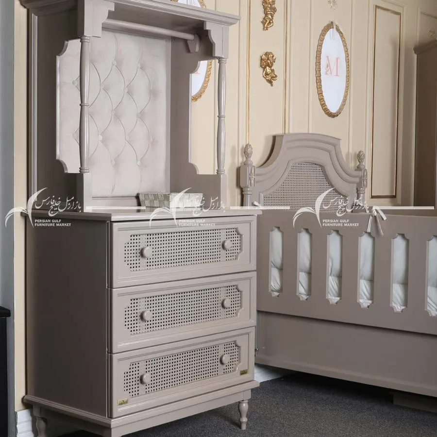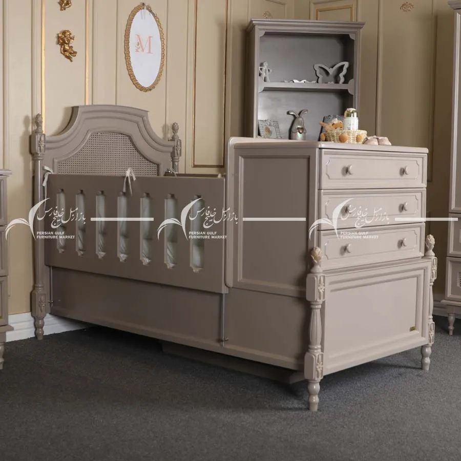 سرویس خواب نوزاد سودا با طراحی کلاسیک، رنگ پتینه طلایی و ترکیب چوب و MDF، انتخابی عالی برای والدینی است که به دنبال اصالت، کیفیت و زیبایی هستند. این سرویس، ترکیبی از شکوه و آرامش را در اتاق نوزاد شما به ارمغان می‌آورد.