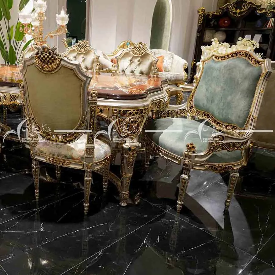 سرویس مبلمان ولنتینو در قالب 9 نفره طراحی شده و مناسب سالنهای بزرگ و دکوراسیونهای سلطنتی است. انحنای نرم در دستهها، پایههای منبتکاریشده و تاج ظریف و هنرمندانه، این محصول را به یکی از درخشانترین نمونههای مبلمان استیل تبدیل کرده است.